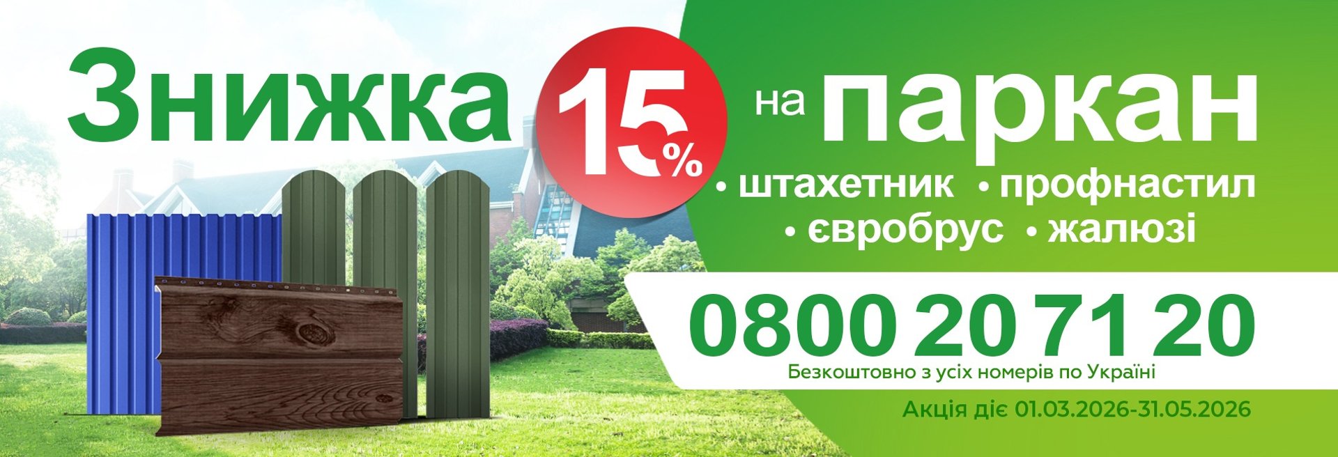 З 01.03.2026 по 31.05.2026 діє знижка -15% на весь асортимент парканів та огорож